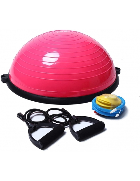 • Dimensions et aspect : hauteur : 25 cm. Diamètre max. : Cadre 63 cm/maximum hémisphère 58 cm. Avec la pompe à air et les deux cordes d'entraînement, la balle de stabilité peut être rapidement et facilement gonflée avec une charge maximale de 150 kg. Avec des anneaux antidérapants et des pieds antidérapants, la technologie anti-explosion assure une utilisation sûre.