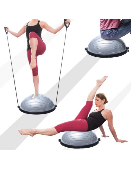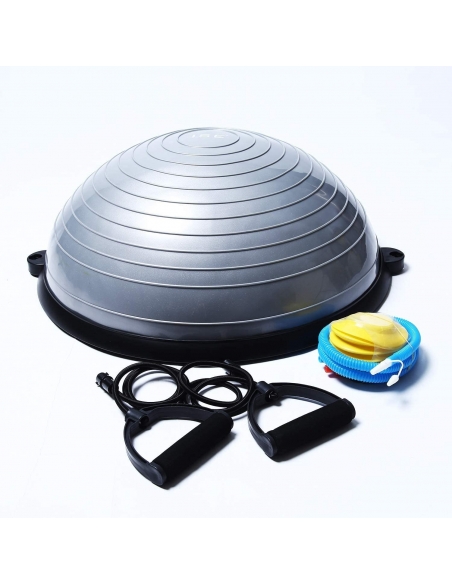 - Dimensions et aspect : hauteur : 25 cm. Diamètre max. : Cadre 63 cm/maximum hémisphère 58 cm. Avec la pompe à air et les deux cordes d'entraînement, la balle de stabilité peut être rapidement et facilement gonflée avec une charge maximale de 150 kg. Avec des anneaux antidérapants et des pieds antidérapants, la technologie anti-explosion assure une utilisation sûre.